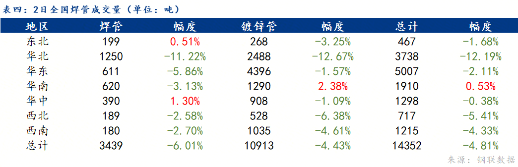 Mysteel钢管事业部调研统计:12月2日,全国178家焊管贸易商样本企业成交总量为14352吨,其中焊管3439吨,镀锌管10913吨,总体成交量较上一交易日下降4.81%。从区域上来看,焊管成交量除东北和华中区域增加,其他区域均有减少;镀锌管成交量除华南区域增加,其他区域均有减少;全国焊管、镀锌管成交量总体小幅减少。