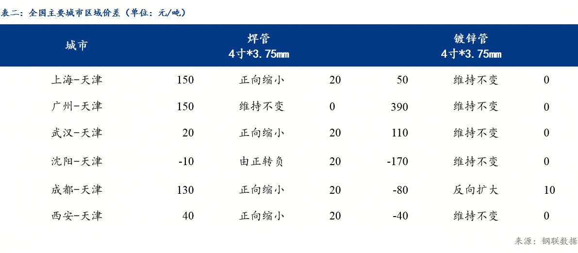 今日全国焊管市场除广州市场价差维持不变,沈阳市场由正转负20元/吨外,其他市场均正向缩小20元/吨;全国镀锌管市场价差除成都市场价差反向扩大10元/吨外,其他市场价差均维持不变。