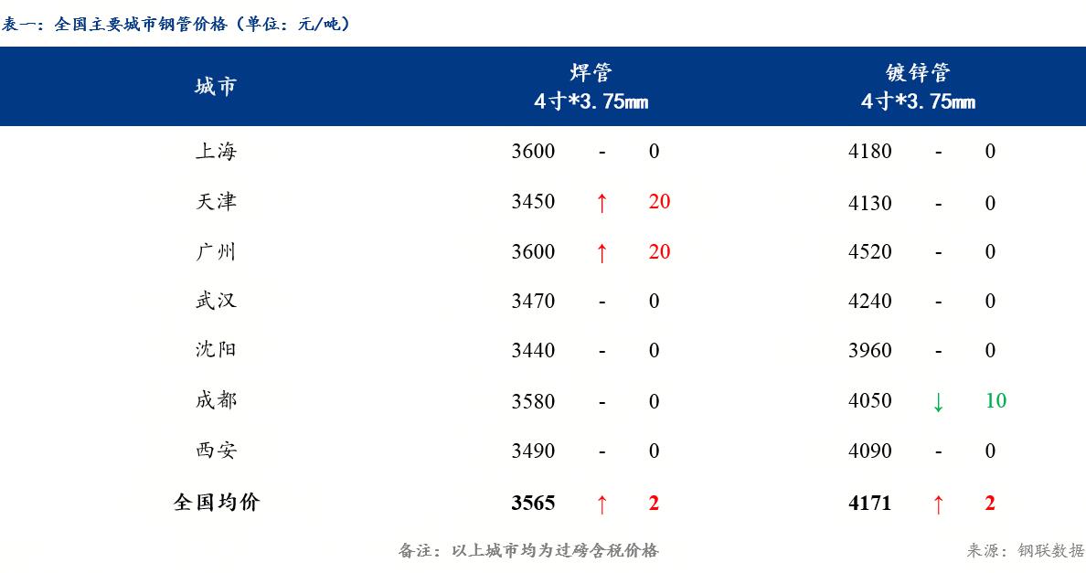 今日全国主要城市焊管、镀锌管价格多稳,个别城市钢管涨降互现。全国28个城市4寸*3.75mm焊管均价涨2元/吨至3565元/吨,4寸*3.75mm镀锌管均价涨2元/吨至4171元/吨。